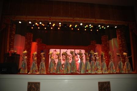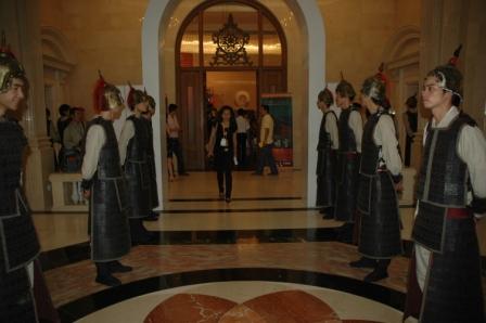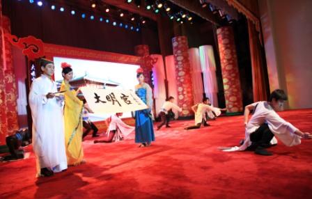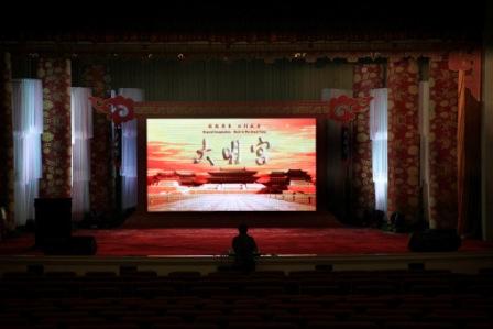 2009年9月3日14时30分,华贵典雅的人民大会堂三层礼堂,这一刻突然像回到了1000多年前的大唐王朝,古色古香的大明宫正门“丹凤门”两边,是身着宫廷服饰、妆扮精美的“宫女”和“金吾卫”。穿过“丹凤门”,一个风华绝代、极富皇家宫廷气派的“现代化宫殿”,恍然如梦般出现在来宾眼前。如此美丽的舞台,让你以为回到了大唐的大明宫,但这里又不是大唐的大明宫。