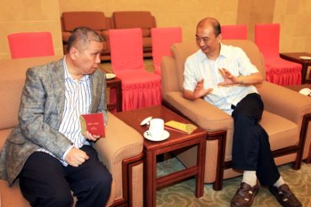 首映礼总策划总导演周小雨(左)与全国人大常委会原副委员长蒋正华合影留念
