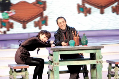 张艺谋坐在八仙桌前和闫妮搭戏,一个演食客,另一个演风骚的老板娘,闫妮往张艺谋身上一靠,两个人都忍不住笑场。
