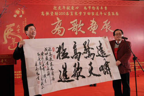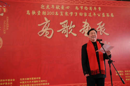 此次画展,素有“虎王”之称的高歌避繁为简,并从画展节省的经费中拿出6万元,资助200名因家贫不能回家过年的大学生。画展现场“虎王”资助了十名来自中央民族大学的学生,同时,联合国世界和平基金会也在现场隆重颁发了“人类和平文化奖”授予高歌。在即将到来的虎年,高歌希望这些大学生能回到亲人身边,过一个温暖的,热闹的,有纪念意义的,虎虎生威的虎年春节。