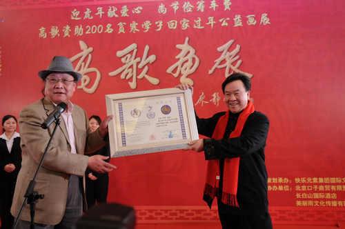 此次画展,素有“虎王”之称的高歌避繁为简,并从画展节省的经费中拿出6万元,资助200名因家贫不能回家过年的大学生。画展现场“虎王”资助了十名来自中央民族大学的学生,同时,联合国世界和平基金会也在现场隆重颁发了“人类和平文化奖”授予高歌。在即将到来的虎年,高歌希望这些大学生能回到亲人身边,过一个温暖的,热闹的,有纪念意义的,虎虎生威的虎年春节。